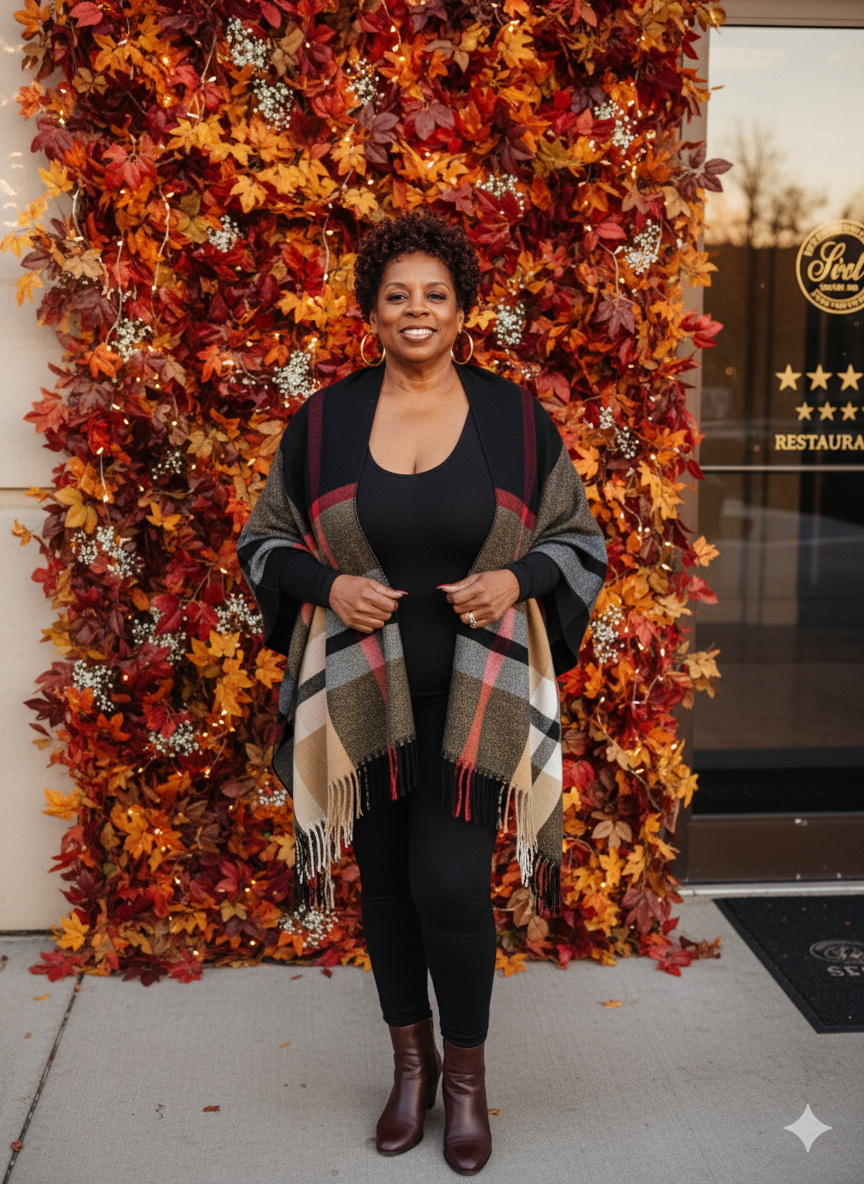 Beautiful, warm, and cozy black plaid poncho with arms and tassels. 100% Acrylic